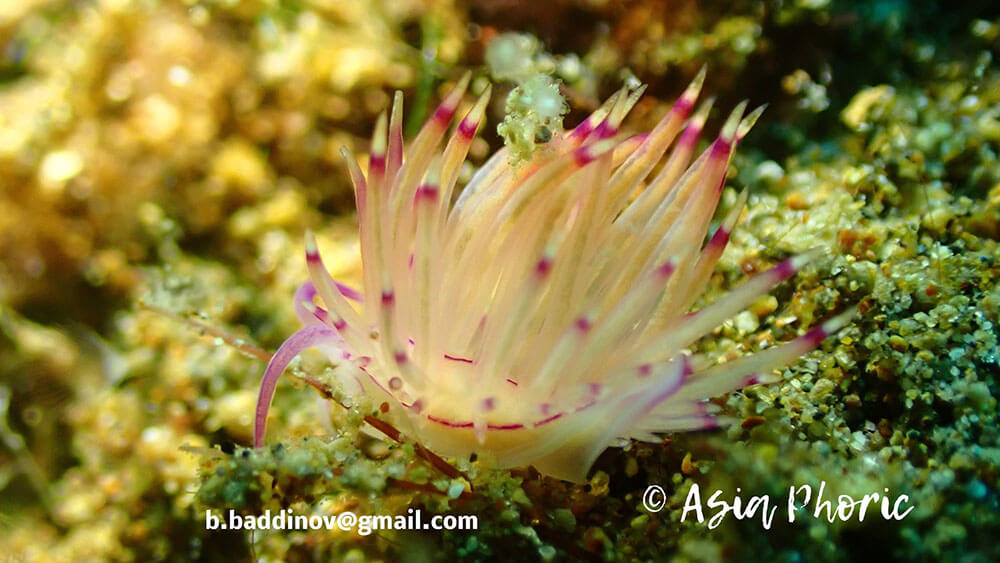 - The classic coloration: the body is milky white to translucent, three reddish to purple continuous or dotted lines are running on both side and in the middle of the body, oral tentacles and rhinophores are whitish with a mauve to purple ring at two-thirds of their extremity, cerata are also whitish with a purple ring and with orange tip.